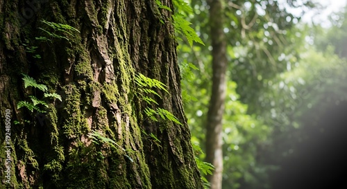 © Jakarta, Obraz premium Thick tree trunk covered in vibrant green moss and small ferns in a sunlit forest