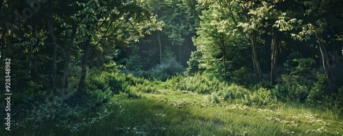 © Coosh448, Fototapeta premium Thick underbrush in a summer forest, 4K hyperrealistic photo