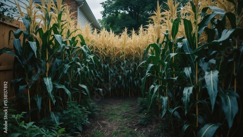 © Lasvu, Obraz premium Thickets Of Corn In Garden In Backyard On Summer Day