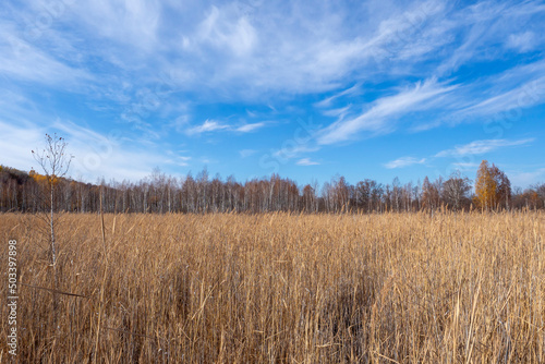 Obraz premium Thickets of dry reeds, swamp. Beautiful autumn natural landscape.