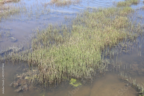 Fototapeta premium thickets of grass on a pond pond in shallow water near the shore in the countryside in May in the Moscow region, 2024 2