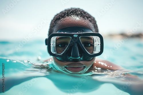 Naklejka premium Thin African American boy in snorkel diving in ocean during summer Vacations relaxation childhood