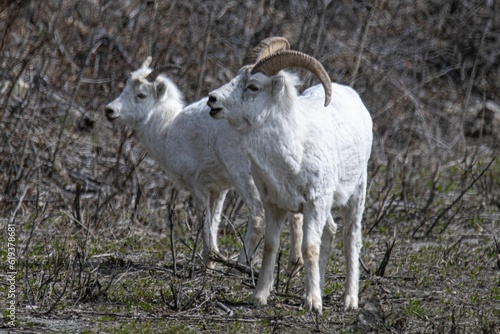 Fototapeta premium Thin-horned rams (Ovis dalli) on a lush, grassy hillside