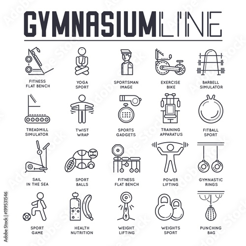 Naklejka premium Thin line sporty men and women doing exercises and working out in gymnasium. Flat outline people working out in sport gym vector illustration concept.