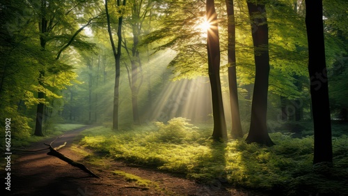 © mg photo, Fototapeta premium Thin sunrays shining in the middle of a deciduous forest in springtime created with Generative AI