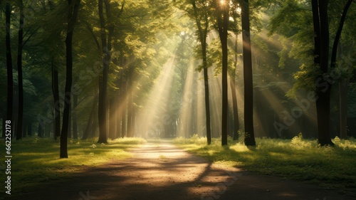 © mg photo, Fototapeta premium Thin sunrays shining in the middle of a deciduous forest in springtime created with Generative AI