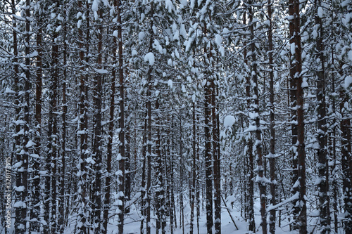 © Believein39, Fototapeta premium thin trees in the dense forest covered with snow