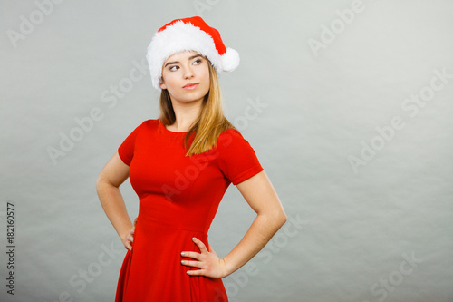 Obraz premium Thinking woman wearing Santa Claus helper costume