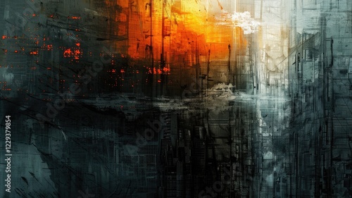 Naklejka premium This abstract artwork features distressed amber and apricot light, creating a dramatic visual atmosphere. The interplay of colors and textures invites deep interpretation and exploration.