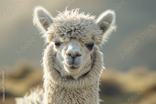 © Jennie Pavl, Obraz premium This adorable alpaca is grinning from ear to ear, showcasing its irresistibly fluffy coat.