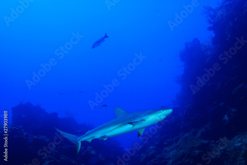 Fototapeta premium This apex predator is a reef shark shot in the wild in its natural habitat. The impressive creature lives in the warm tropical waters of the Cayman Islands.