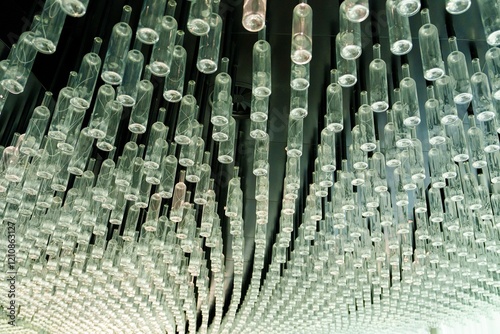 © Ilja, Obraz premium This artistic installation features a captivating collection of glass bottles suspended from the ceiling, creating a unique visual experience that transforms the gallery space.