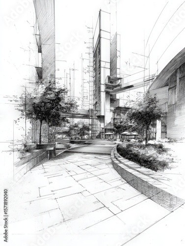 Fototapeta premium This artistic representation features a detailed urban environment. It highlights modern buildings intertwined with greenery, showcasing landscaped pathways that invite exploration.