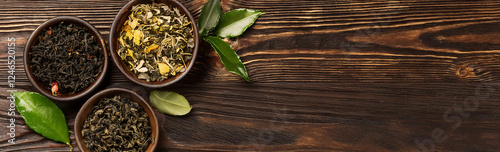 Fototapeta premium This banner showcases an assortment of tea leaves in wooden bowls on a dark wooden background. The vibrant colors and textures of the dried tea leaves are highlighted by the rustic setting