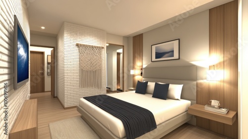 Fototapeta premium This boho-style bedroom features a stylish bed adorned with pillows and...