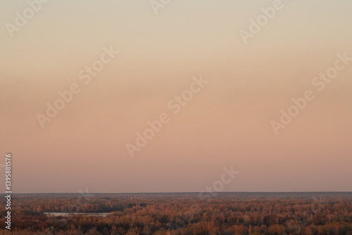 Fototapeta premium This breathtaking view captures the horizon as the sun sets, illuminating the vast landscape filled with autumn colors. The peaceful scene showcases nature's beauty at dusk
