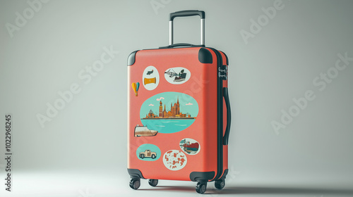 Fototapeta premium This bright coral suitcase features an array of travel stickers depicting famous landmarks and activities, set against a simple backdrop that emphasizes its colorful design.
