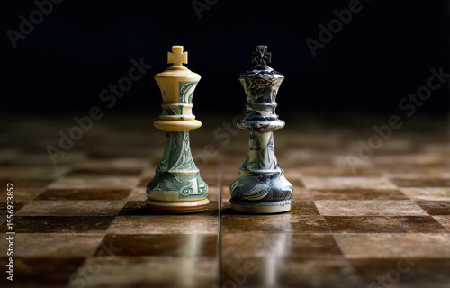© Narongsak, Fototapeta premium This captivating image juxtaposes a king chess piece crafted from currency, symbolizing the interplay of wealth and strategy, as they stand prominently on a checkerboard.