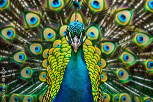 Fototapeta premium This captivating peacock showcases its colorful feathers, intricately...