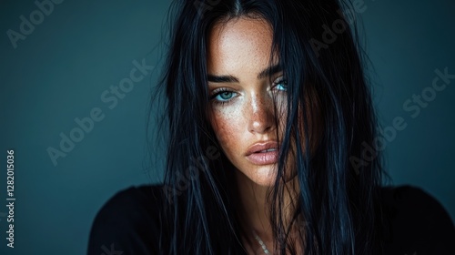 Fototapeta premium This captivating portrait showcases a woman's intense gaze and freckled skin, with wet hair framing her face, creating an alluring sense of raw emotion and passion in visual art.