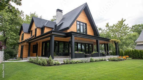 © Viktoriia Kan, Obraz premium This charming modern rustic house features wood accents, black windows, and a stone chimney, nestled amidst lush trees and a vibrant green lawn