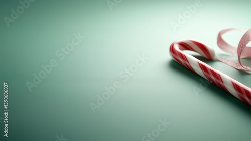 Fototapeta premium This close-up features a striped red and white candy cane adorned with a festive ribbon, resting against a soft pastel green background, perfect for holiday cheer