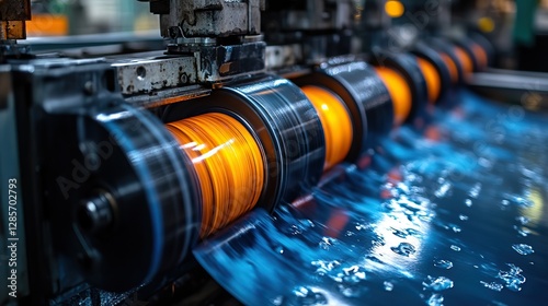 Fototapeta premium This close-up shot highlights high-quality magazine, brochure, and poster printing services, showing the printing machine rollers and freshly printed materials.