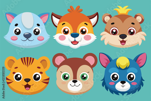 Naklejka premium This collection showcases adorable animal heads designed in a vibrant, playful vector style, Vector collection of cute animal heads