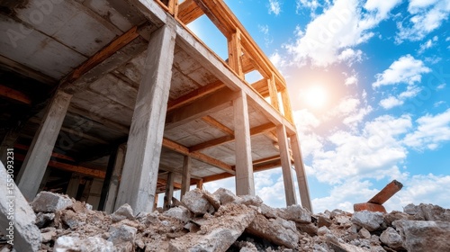 © svastix, Obraz premium This construction scene reveals a mix of rubble and framework under blue skies, symbolizing progress and transformation in urban development.