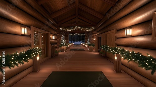 Fototapeta premium This cozy porch is beautifully decorated with lights and garlands, featuring flickering candles and a warm blanket, perfect for a relaxing winter evening