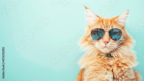 Fototapeta premium This delightful ginger cat showcases its playful spirit by wearing stylish sunglasses against a soft, light cyan background. Its fun personality shines through, inviting smiles.