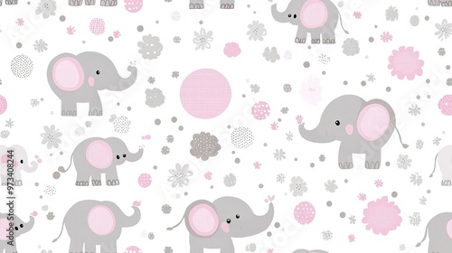 Fototapeta premium This delightful pattern features cute baby elephants in pastel pink, grey,...