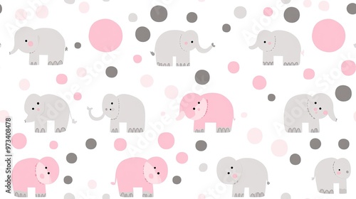 Fototapeta premium This delightful pattern features cute baby elephants in pastel pink, grey, and sage green against a white background adorned with polka dots, ideal for playful creations SEAMLESS PATTERN
