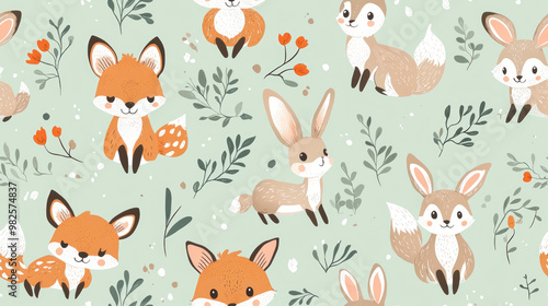 Fototapeta premium This delightful pattern showcases cute woodland creatures, including a fox, deer, and rabbits, surrounded by leaves, perfect for a whimsical design project.