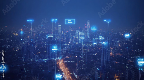 © Mahmud, Fototapeta premium This description provides a comprehensive overview of the concept of a smart city with 5G communication networks and IoT, emphasizing the interconnectedness and advanced technological infrastructure.