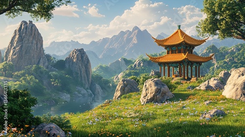© Velar, Obraz premium This digital artwork, titled Serene Mountain Lake Pavilion, beautifully portrays a peaceful lakeside scene surrounded by majestic mountains