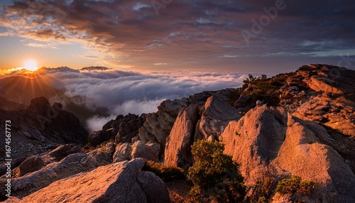 Fototapeta premium this dramatic image showcases rugged rocky terrain illuminated by the first light of dawn with clouds dispersing evoking a sense of adventure and the untamed beauty of nature