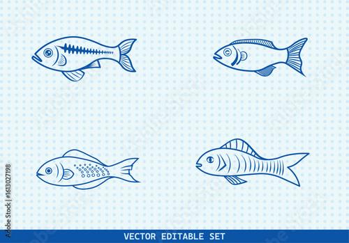 Fototapeta premium This editable vector set features four unique hand-drawn fish illustrations. perfect for seafood menus, kids’ books, educational materials, aquarium infographics