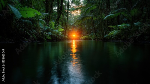 Obraz premium This enchanting image captures the serene beauty of a lush forest at sunset,...