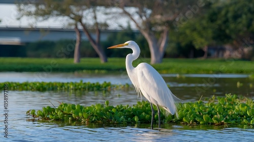 © CreativeCreators, Fototapeta premium This eye-level shot shows a great egret in a swampy area. Its pure white feathers stand out against the greenery and water.