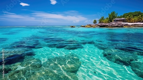 Fototapeta premium This Fantastic Commercial Shot capture the Clean Sea of Maldives and an Island in the Background with a lot of vegetation. Generative AI.