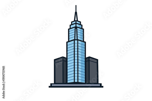 © icon_art, Obraz premium This flat vector graphic depicts a tall blue office building with a pointed spire and two shorter grey structures on either side, isolated on a dark black background.