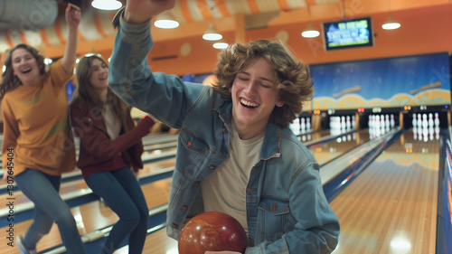 Fototapeta premium This Friends are having a great time bowling and celebrating a lively party atmosphere together.