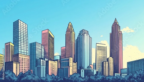 Fototapeta premium This illustration shows a detailed cityscape, featuring numerous skyscrapers of varying heights and architectural styles against a clear, bright sky.