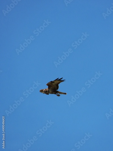 Fototapeta premium This image captures a buzzard in flight, its powerful wings propelling it...