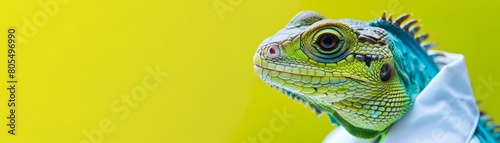 © JK_kyoto, Fototapeta premium This image captures a closeup halfbody of a charismatic reptile in a scientists white lab coat