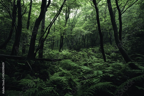 Fototapeta premium This image captures a lush forest teeming with vibrant greenery and abundant ferns, exuding a sense of peace and the untouched beauty of the wild.