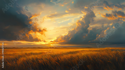 © Thiago, Fototapeta premium This image captures a stunning sunrise over a vast field, with dramatic clouds and golden light illuminating the landscape. Dramatic. Illustration
