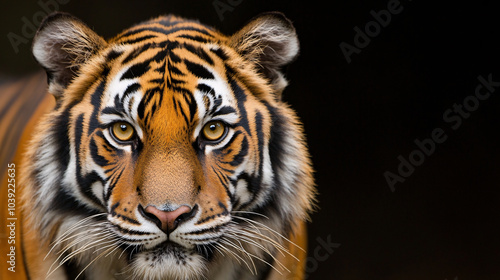 © Thamrong, Naklejka premium This image captures the bold, bright yellow eyes of a tiger in a detailed close-up. The tiger’s fur, dark orange with black stripes, subtly frames the eyes while the background is solid black,