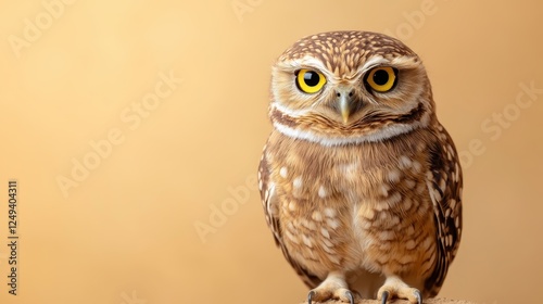 © JoxyAimages, Naklejka premium This image features a beautiful owl with distinctive yellow eyes, showcasing its intricate feather patterns against a soft, warm-toned background, embodying nature's stunning beauty.